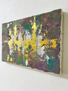 【作品紹介】P4 テクスチャーアート「森羅万象」【ハイライン】| Shinrabanshou ゴールドの輝きが眩しい テクスチャーペーストはマットです P4 砂粒が入っています Table of Contents Toggle 静寂を感じる色彩と美しいマチエールの「森羅万象」【作品詳細】 静寂を感じる色彩と美しいマチエールの「森羅万象」色とテクスチャーが複雑に絡み合う、お部屋に最適のテクスチャーアートです。日本画の影響を受けた、手描きのオリジナル抽象画。馴染みやすい濁りのある色味をベースに、光り輝くゴールドを乗せました。落ち着いた色のグラデーションとマチエールは、見ていて心を落ち着かせてくれます。閑寂な佇まいが感じられる、Yukaの傑作。なお、土台にはカラーサンドを使ったオリジナルテクスチャーも調合。ザラザラとした粒子を中央部に配置しているので、ゴールドが飛沫したように見えます。視覚と触覚を同時に刺激されて知的好奇心が湧き上がりますので、ぜひ細部までご覧ください。お部屋に飾っても奇抜にならない現代アートです。ぜひ日常の一部として取り入れてください。【作品詳細】HSコード:9701.10(オリジナル手描きアート)素材・技法:キャンバス、アクリル絵の具、ジェルメディウム、ホルベインモデリングペースト、リキテックスモデリングペースト、カラーサンドサイズ・重さ:P4(333×220x20mm)、約0.5kgサイン・証明書:裏面にサイン/証明書付き包装方法:保護梱包+箱発送方法:追跡番号あり発送発送までの日数:3~5日こちらの作品はShopifyでご購入いただけます。今後もブログやInstagramで新作情報をお届けしますので、ぜひフォローしてください。 メルマガでお便りを受けとる アーティスト活動をサポートする その他の記事を読む 前の投稿【作品紹介】フレッシュで明るいオレンジ色のバラの花:A solitary, graceful rose 次の投稿【作品展示中】【10月】西神中央ホール「なでしこ芸術文化センター」にて作品展示中です おすすめ 大人の塗り絵 #01:自然と日本文化を感じるレトロ・モダン 2025年1月9日 【お知らせ】ハイラインのテクスチャーアート「動」「遊」 2025年6月24日 【新作】気品と力強さが調和する。コンセプチュアルな抽象画「蓮」「静」 2025年4月7日 コメントを残す コメントをキャンセルコメントコメントする名前またはユーザー名を入力してください メールアドレスを入力してコメント Web サイトの URL を入力してください。(任意) 次回のコメントで使用するためブラウザーに自分の名前、メールアドレス、サイトを保存する。 Δ タグ: shopify, Yuka Mitsufuji, アート 販売, インテリア, テクスチャーアート, 光藤有佳